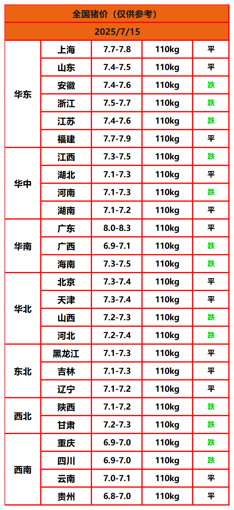 2025年7月15日猪价,今日全国猪价行情走势:0涨13平13跌。