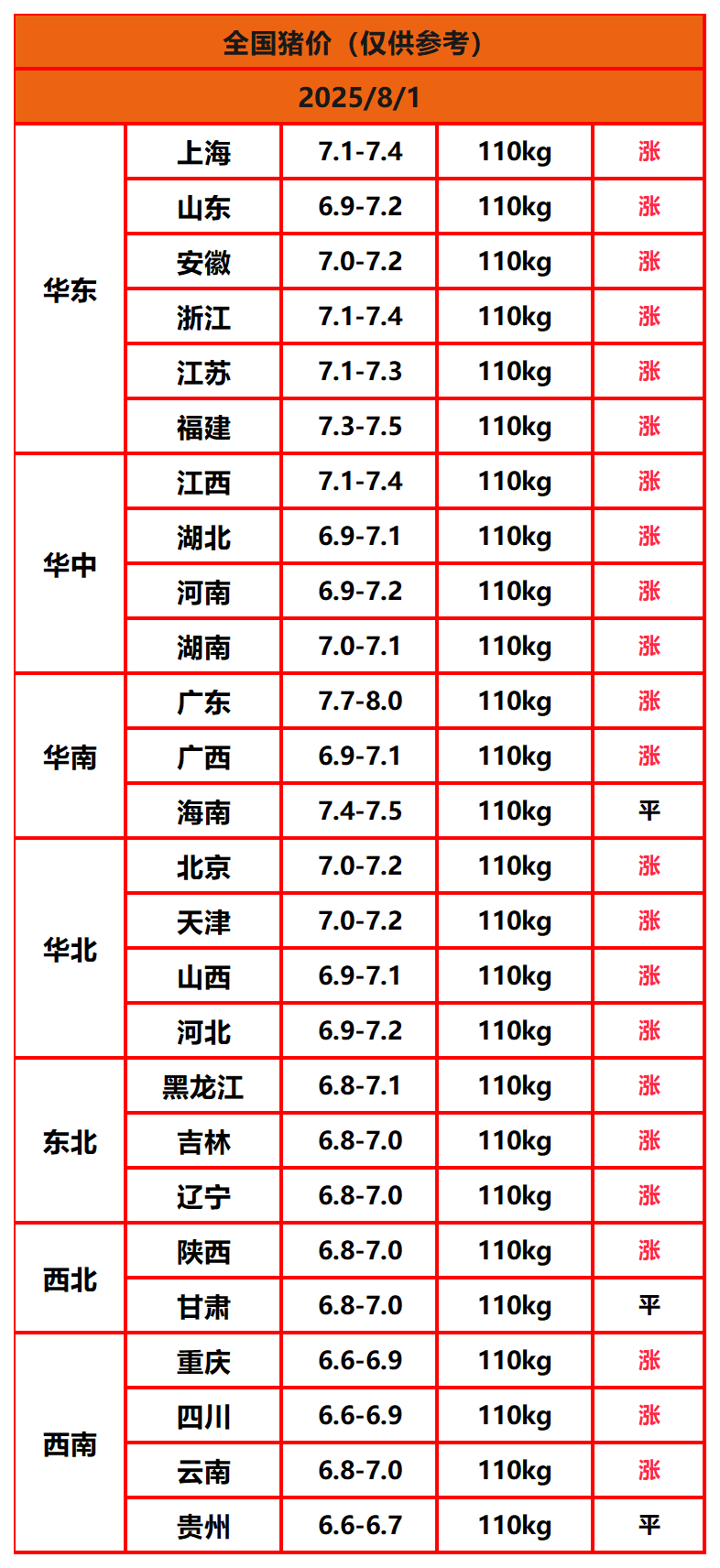 2025年8月1日猪价,今日全国猪价行情走势:23涨3平0跌。