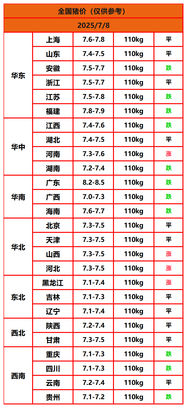 2025年7月8日猪价,今日全国猪价行情走势:4涨11平11跌。