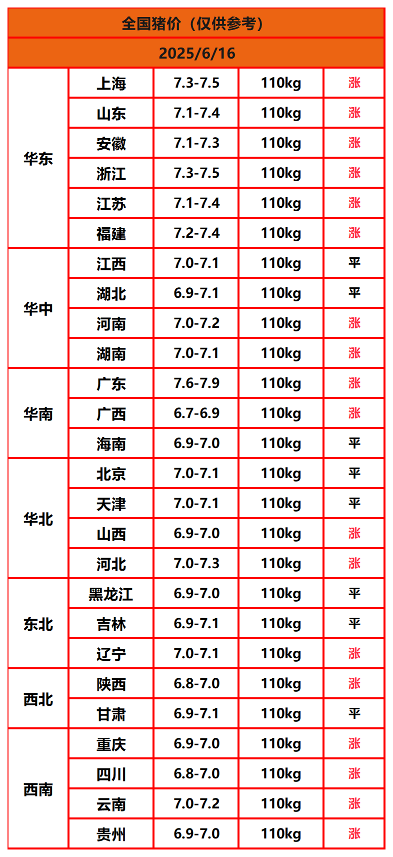 2025年6月16日猪价,今日全国猪价行情走势:18涨8平0跌。